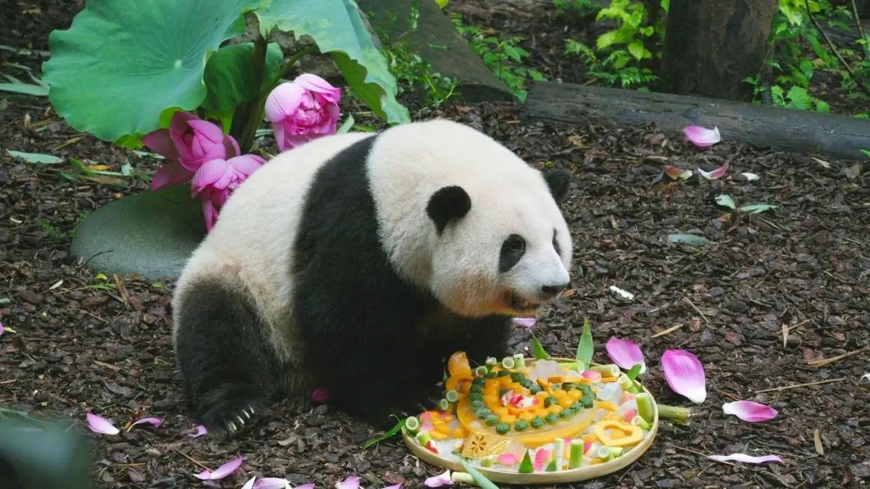 7月4日,大熊猫“和花”在它五岁生日这天享用自己的“生日蛋糕” 杨寅 摄