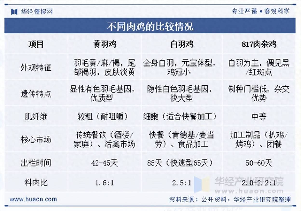 我国肉鸡主要包括白羽肉鸡、黄羽肉鸡、817肉杂鸡和淘汰蛋鸡。白羽肉鸡属于快大型肉鸡,与黄羽肉鸡相比,其特点是生长速度快、料肉比较低、产肉量多,适合工业规模化生产,但是口感欠佳。黄羽肉鸡是我国自主培育的肉鸡品种,具有品种多、生长周期长、抗病能力强等特点,其肉质口感鲜美壹资网,更符合我国传统的烹调习惯。