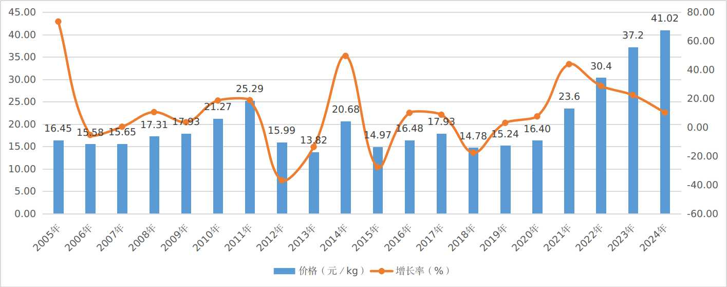 云南省咖啡生豆平均价格变化趋势(2005-2024年)